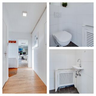 Entree, hal, wc met fontein, drie separate kantoorruimtes, pantry.