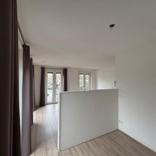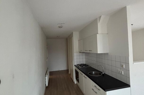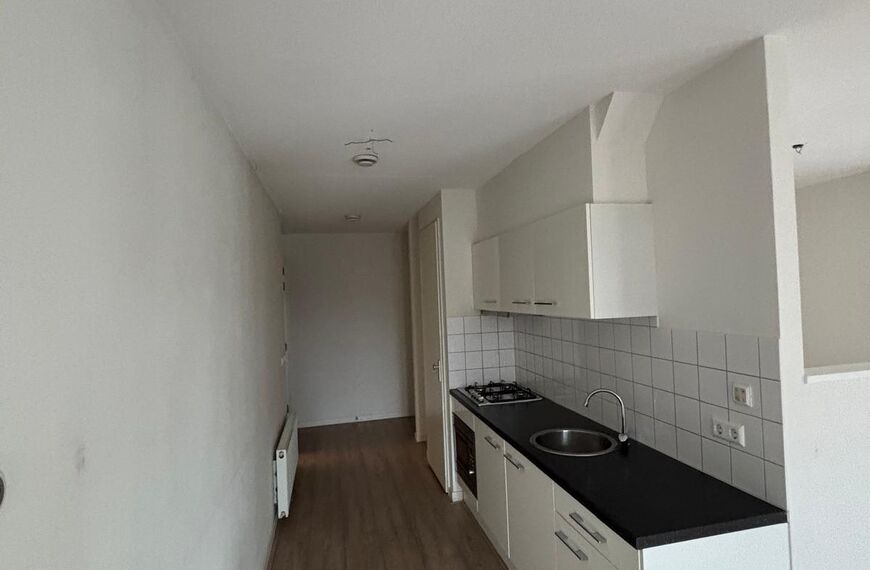 1e verdieping: Studioappartement: entree, gang, meterkast, badkamer voorzien van een inloopdouche, een wastafel en een toilet. De half open keuken heeft een keukenblok in lengte opstelling. De woonkamer is voorzien van Franse balkons en uitgevoerd met kozijnen die tot de vloer doorlopen wat voor veel lichtinval zorgt, aansluitend het slaapgedeelte.