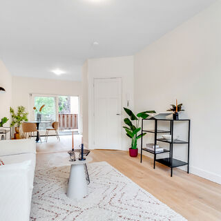 1e verdieping: Overloop met toiletruimte en toegang tot de ruime lichte living en de werkkamer. De living heeft een open keuken aan de voorzijde en een ruime woonkamer aan de achterzijde met een schuifpui naar het balkon.