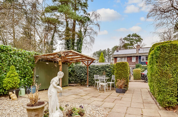 De achtertuin ligt op het zonnige zuiden en heeft een berging met een aansluiting voor wasmachine en droger. In de diepe voortuin staat een overkapping voor bijvoorbeeld fietsen.