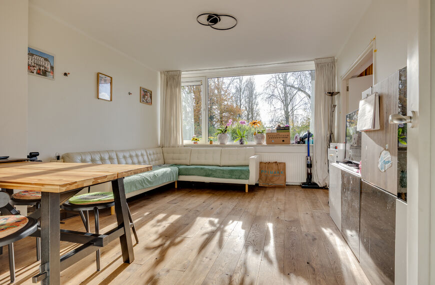 Ruime hal met toegang tot de moderne keuken voorzien van inbouwapparatuur en toegang tot een klein balkon aan de voorzijde. De woonkamer is lichte met vrij uitzicht over het achtergelegen plantsoen. Via de naastgelegen kamer is de buitentrap naar de grote zonnige tuin bereikbaar.