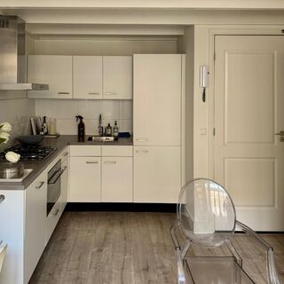 De woonkamer is licht, efficiënt ingericht en vormt samen met de open keuken een prettig leefgedeelte. De keuken biedt naast inbouwapparatuur ook kastruimte. In de hal bevindt zich een wc.