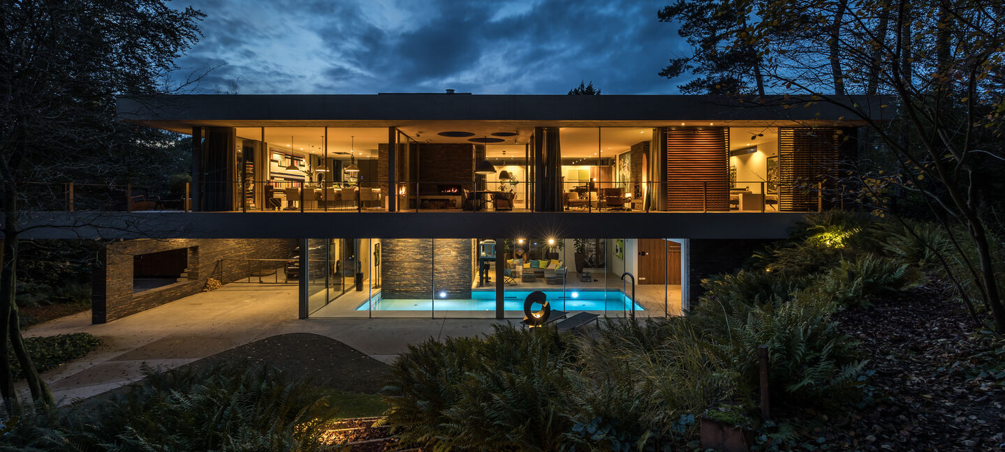 Souterrain: Hier bevindt zich de intieme thuisbioscoop en een glazen doorkijk die zicht biedt op de onderwaterwereld van het zwembad erboven.