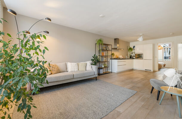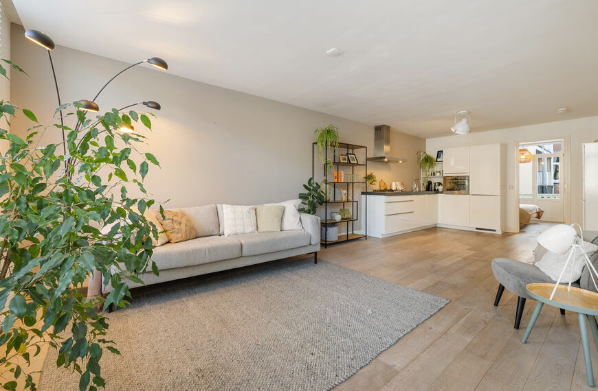 Het gehele appartement is voorzien van een eikenhouten lamelparketvloer met whitewash afwerking. De wanden zijn strak gestuukt en recent geschilderd, waardoor de woning fris en instapklaar aanvoelt. Het houtwerk is wit geschilderd en netjes onderhouden. Verder beschikt het appartement over houten kozijnen met draai-kiepramen en HR++ isolatieglas.