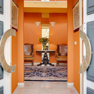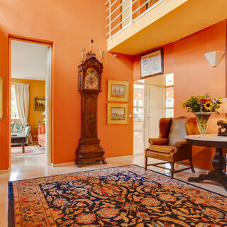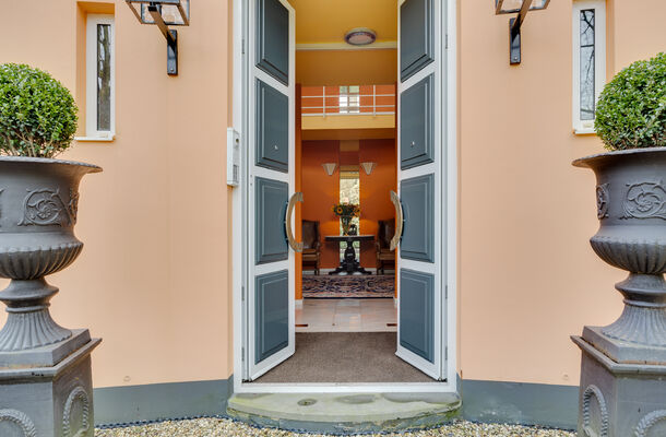 Entree met toegang tot de ruime ontvangsthal met gaderobe en toilet. De dubbele deur aan de rechterzijde geeft toegang tot de sfeervolle woonkamer met haard, openslaande deuren en aansluitend de eetkamer met een prachtige halfronde erker, eveneens met openslaande deuren naar de schitterende tuin op het zuiden.