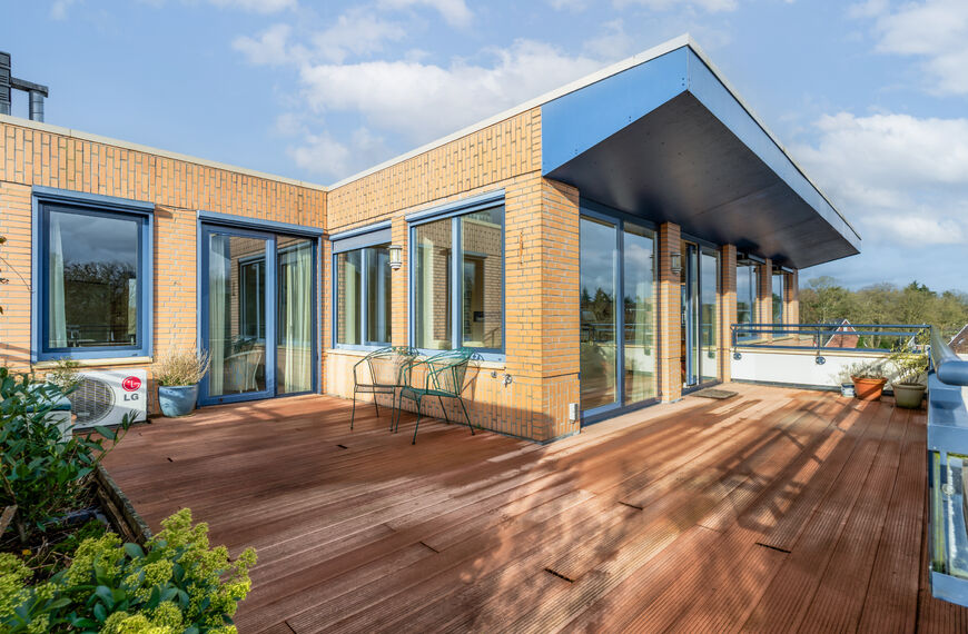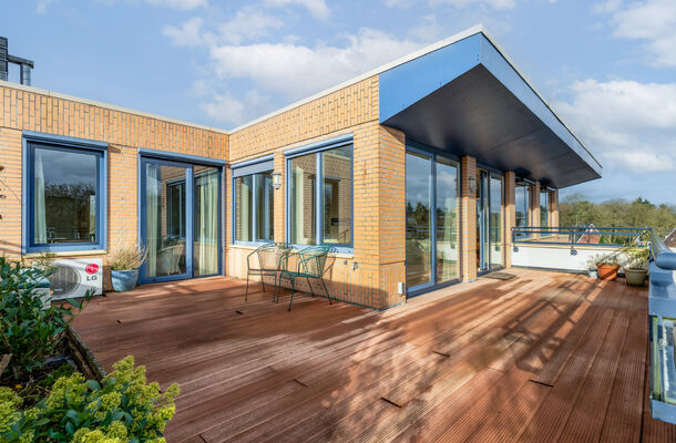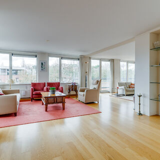 Via de afgesloten centrale entree met videofoon bereikt u met de lift de bovenste verdieping van het gebouw. Binnenkomst in een verrassend ruime ontvangsthal met gastentoilet en toegang tot de verschillende vertrekken. De woning beschikt over een zeer fraaie en sfeervolle living met toegang via een grote schuifpui tot het grootste dakterras. De living is prettig ingedeeld met een gezellige woonkamer met open haard en een ruime eetkamer. Door de grote ramen is de ruimte licht en aangenaam en heeft u een mooi vrij uitzicht.