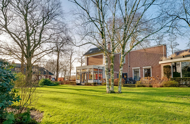 Het aangebouwde kantoor/bedrijfspand met voormalige garage heeft een aparte eigen entree/toegang, maar is eveneens bereikbaar via een tweede hal. Het vormt een mooi, modern contrast met het klassieke hoofdgebouw. Er zijn ronde vormen gebruikt en veel glas, zowel binnen als in de buitengevel. In de grote kantoorruimte beneden heeft u het gevoel buiten, tussen groen en bomen, te vertoeven. Een zeer aangename werkplek! Verder zijn er hier meerdere aparte vertrekken die geschikt zijn voor verschillende doeleinden en een toilettengroep Op de verdieping zijn er een tweetal fraaie en ruime werk-/leefruimten met beiden toegang tot een groot zonneterras. De ene ruimte is eveneens via de verdieping van de villa bereikbaar.