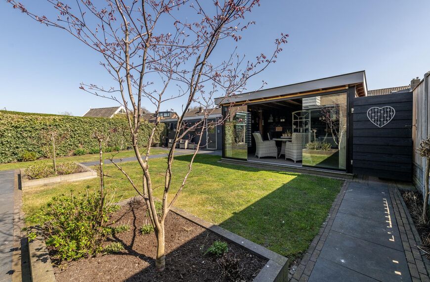 De zonnige achtertuin is zeer ruim, onderhoudsvrij aangelegd en beschikt over een beregeningsinstallatie en een gazon met robotmaaier. In de achtertuin staat een knus ingericht tuinhuis dat met een glazenwand is af te sluiten bij koele avonden. Aan de achterzijde van het perceel bevinden zich tevens twee garageboxen met elektrisch bedienbare kanteldeuren. Ideaal voor de auto’s, motoren of gewoon een fijne klusruimte. De voortuin beschikt over een druppelberegening.