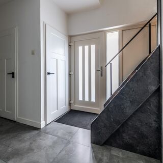 Hal met mooie tegelvloer, een meterkast/voorraadkast, een modern hangend toilet, een ingebouwde schoenenkast en een trapkast met veel bergruimte. De gezellige woonkamer is voorzien van een pvc-vloer met vloerverwarming en een schuifpui naar de serre. De serre biedt een heerlijke plek om te zitten en is zowel te verwarmen als te koelen d.m.v. een airco. Voorts is de serre voorzien van een elektrisch bedienbaar zonnescherm en screens. De halfopen, luxe keuken is voorzien van onder meer een “Belling” oven, grill en inductieplaat, een Quooker, een vaatwasser, een grote koelkast en grote vrieskast alsmede een magnetron. Tevens is de keuken voorzien van een airco.
