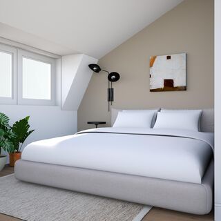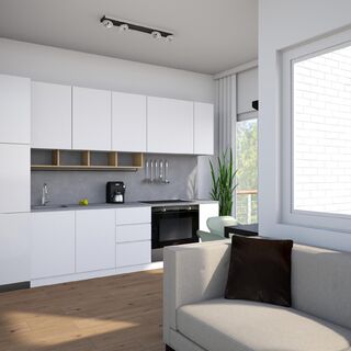 De lichte woonkamer (20 m²) met een plafondhoogte van 2,40 m is een heerlijke plek om te ontspannen. Dankzij de grote ramen valt er veel daglicht naar binnen, wat zorgt voor een open en frisse sfeer. De woonkamer staat in directe verbinding met de moderne keuken, die is uitgerust met inbouwapparatuur. Koken gebeurt hier volledig elektrisch – een bewuste en duurzame keuze voor de toekomst.