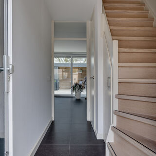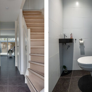 Ruime hal met trapkast en modern toilet. Aan de voorzijde is een luxe en complete woonkeuken o.a. voorzien van Pitt-Cooking, een Quooker, high-end apparatuur van Siemens met o.a een stoomoven, doorlopend naar de ruime grote woonkamer met een schuifpui over nagenoeg de gehele breedte van de woning.