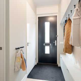 Aan de voorzijde ligt een verzorgd aangelegde voortuin, omzoomd door een beukenhaag. Via het bordes bereikt u de voordeur, die toegang geeft tot de ruime hal met meterkast, toilet met fontein en ruime maatwerk garderobe.
