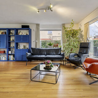 De schuifpui zorgt voor een mooie verbinding met de zonnige achtertuin. Voor extra comfort zijn er een zonnescherm en diverse elektrische screens aanwezig.
