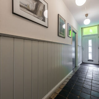 Entree, hal met ruime garderobekast, een ruime woonkamer aan de rechterzijde van de woning en een tweede, qua grootte gelijkwaardige, woonkamer aan de linkerzijde voorzien van parketvloer en houtkachel én toegang tot een provisiekelder.
