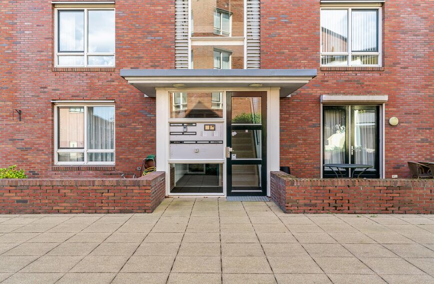 Entree appartement, ruime hal met meterkast en gastentoilet, een royale en lichte woonkamer met apart eetgedeelte en openslaande deuren naar het zonnige terras alsmede een open keuken voorzien van diverse inbouwapparatuur. Aan de keuken grenst een praktische bijkeuken met aansluiting voor de wasmachine en de opstelling van de cv-ketel.