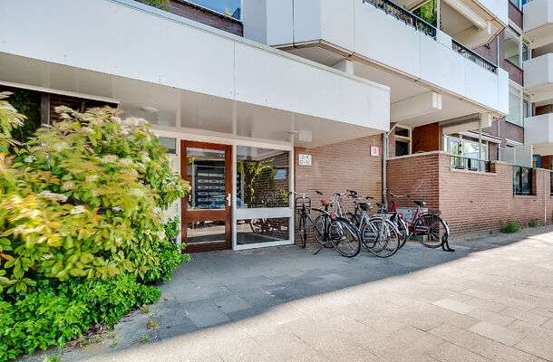 Centrale entree met het bellentableau met intercom en de brievenbussen. Aan de achterzijde is een tweede ingang bij het parkeerterrein dat eigen terrein van de VvE is. De gezamenlijke hal heeft een lift en een trappenhuis. Bij het appartement hoort een eigen berging in het souterrain van het gebouw. Met de fiets kunt u de berging van buitenaf bereiken, via een hellingbaan.