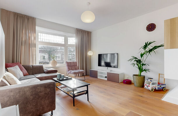 hal met modern toilet en een praktische inpandige bijkeuken met cv-opstelling, groepenkast en mechanische ventilatie-unit. De woonkamer met karakteristieke erker ligt aan de voorzijde van het pand. Aangrenzend bevindt zich een ruimte die thans is ingericht als eetkamer. De ruime woonkeuken aan de achterzijde biedt volop werk- en kastruimte en is uitgerust met alle benodigde inbouwapparatuur. Vanuit de keuken is het riante dakterras bereikbaar: een beschutte en zonnige buitenruimte met onderhoudsarme composiet vlonder en hardhouten schutting, een echte verlenging van het woongedeelte.