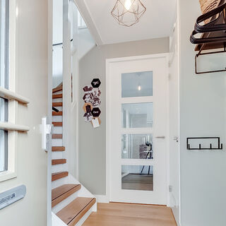 Entree, hal met meterkast, moderne toiletruimte en garderobe, een gezellige woonkamer met sfeervolle gashaard en maatwerk televisiemeubel en boekenkast. De handige trapkast biedt veel bergruimte.
