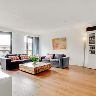 Heerlijk grote en lichte living met maar liefst vier openslaande deuren met Frans balkon, twee aan de voorzijde en twee aan de achterzijde van het appartement. Aan de voorzijde een fijne ruime zithoek en aan de achterzijde een heerlijke ‘woonkeuken’. De fraaie eikenhouten vloer geeft het geheel de juiste uitstraling. Vanuit zowel het zitgedeelte als de woonkeuken geniet je van een vrij uitzicht.