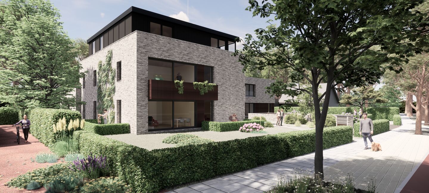 Alle appartementen hebben een mooie buitenruimte: de appartementen op de begane grond hebben goede privé terrassen, van elkaar gescheiden door groene hagen en grenzend aan de gemeenschappelijke tuin. De appartementen op de verdiepingen hebben ook royale terrassen die goed gelegen zijn op de zon. De gemeenschappelijke tuin zal groen en onderhoudsarm aangelegd worden.