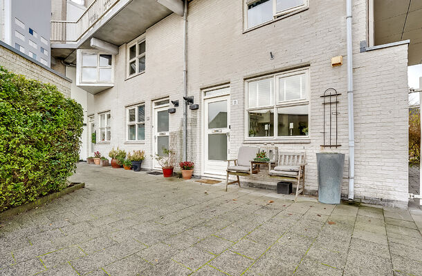 De entree geeft toegang tot een hal met garderobe. Hier bevindt zich ook de opstelling van de combi-ketel en de meterkast. De wc met fonteintje is modern uitgevoerd. De woonkamer heeft een open en rustige uitstraling door de doorlopende vloer en de fijne lichtinval. Aan de tuinzijde is voldoende plek voor een zitgedeelte, waarbij openslaande deuren veel contact met buiten geven. Aan de voorzijde ligt de keuken, ingericht met een praktisch werkblad, diverse inbouwapparatuur en voldoende opbergruimte. Het keukenraam zorgt voor extra licht en zicht op de voorzijde van het complex.