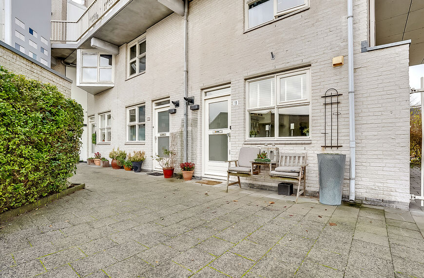 De achtertuin grenst aan een gemeenschappelijke groenstrook, waardoor er een prettig gevoel van ruimte en privacy ontstaat. De tuin is ingericht met houten hardhouten planken en groen voor privacy. Aan de voorzijde van de woning bevindt zich een separate berging, ideaal voor het stallen van fietsen.