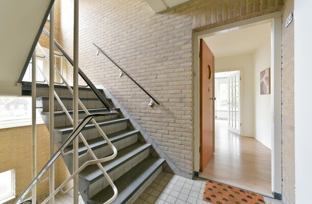 Eerste verdieping: entree met ruime en lichte hal, bergkast, modern gerenoveerd toilet en toegang tot de royale woonkamer vanwaar er toegang is tot het balkon. Deze ligt op het Zuidwesten over de volle breedte van de woonkamer en is voorzien van bergkast. De woonkamer is afgewerkt met een laminaatvloer, stucwerkwanden en -plafonds, en grote raampartijen in voor-, achter- en zijgevel. De dichte keuken is ca. 3.00 x 2.49 m. en uitgevoerd met een eenvoudige hoekkeuken voorzien van koelkast, gasfornuis met oven en een wasmachine. Voorts zijn er 2 slaapkamers, beiden voorzien van een laminaatvloer. De gerenoveerde badkamer is voorzien van een fraaie inloopdouche en een wastafelmeubel.