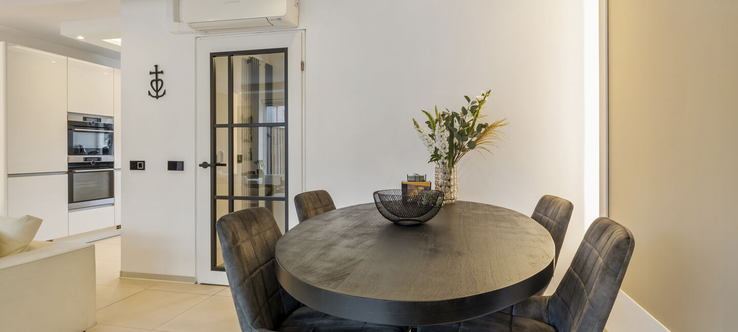 Aan de voorzijde van de woning bevindt zich de moderne keuken, die in 2020 volledig is vernieuwd. De keuken is uitgerust met hoogwaardige inbouwapparatuur, waaronder een inductiekookplaat met afzuiging, combi-oven, combimagnetron, vaatwasser en een ingebouwde koel-/vriescombinatie. Vanuit de keuken heb je prettig uitzicht op de straat.