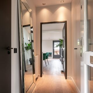 Via een trap in de voortuin bereikt u de entree van de woning. In de hal bevindt zich de garderobe, meterkast en het moderne toilet. Direct bij binnenkomst in de woonkamer valt de ruimtelijkheid op door de hoge plafonds en de open verbinding tussen het zitgedeelte, de eetkamer en de keuken. De woonkamer is voorzien van een strakke vloer en wordt extra ruimtelijk door de hoge raampartijen, die zorgen voor een fraaie lichtinval. Vanuit de in 2021 geplaatste keuken kijkt u uit over de voortuin; de keuken is voorzien van alle denkbare inbouwapparatuur. Direct grenzend aan de keuken bevindt zich de wasmachine & droger ruimte.