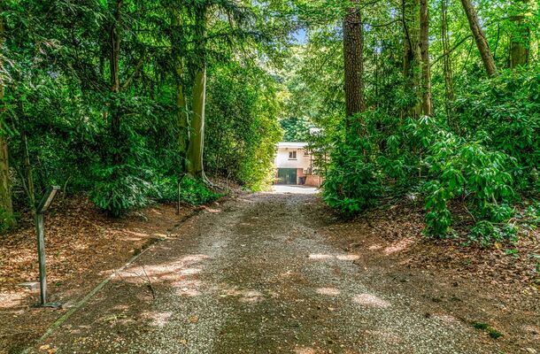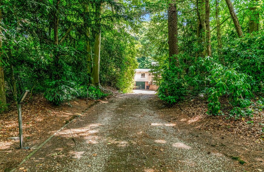 De villa is prachtig gesitueerd op het perceel, dat grenst aan volwassen bomen en hoogteverschillen kent een zeldzaam verschijnsel in deze regio. De deels bostuin is mooi aangelegd met diverse terrassen, looppaden, glooiingen en beschutte zitplekken. Hier geniet u het hele jaar door van groen, vogels, rust en privacy. Het terrein biedt tevens ruimte voor bijgebouwen of een zwembad, indien gewenst en toegestaan. Naast de villa is er een grote garage en daarachter en tevens van binnenuit bereikbaar een grote bergschuur.